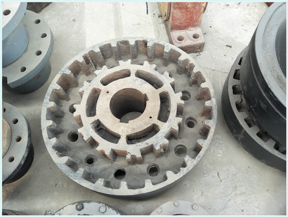 球磨机胶块联轴器是各种球磨机传动中的重要部件,磨机配用胶块联轴器,除了能够补偿传动轴的相对位移,下降联轴器的装置对中精度要求外,更重要的是能够平缓冲击,改动轴系的自振频率,防止产生严峻的危险性振荡。大致上能够分为固定端(小齿轮端)、活动端和轴套及胶块四部分所组成,直径800mm标准的胶块联轴器广泛适用于2.2米球磨机、2.4米球磨机和3.2X13米球磨机的电机和减速机的衔接,原料分铸铁和铸钢两种,大范围的应用于水泥、石膏、粉煤灰、矿渣、选矿各种球磨机